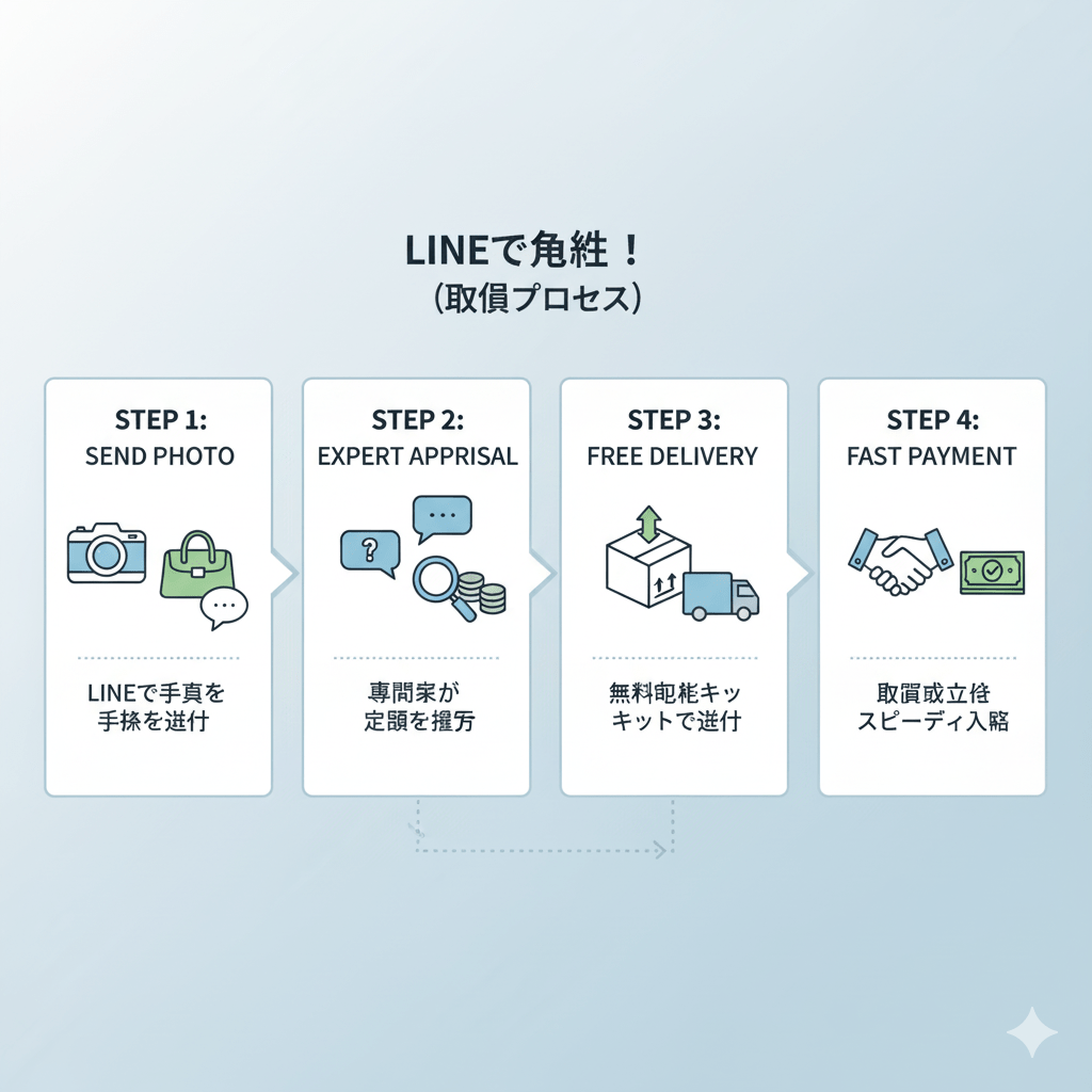 中でも注目されているのが「LINE査定」。スマートフォンで商品の写真を撮り、トークで送信するだけでおおよその査定額が確認できる画期的なサービスです。